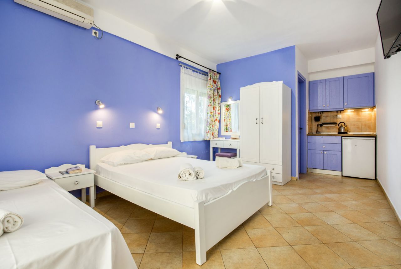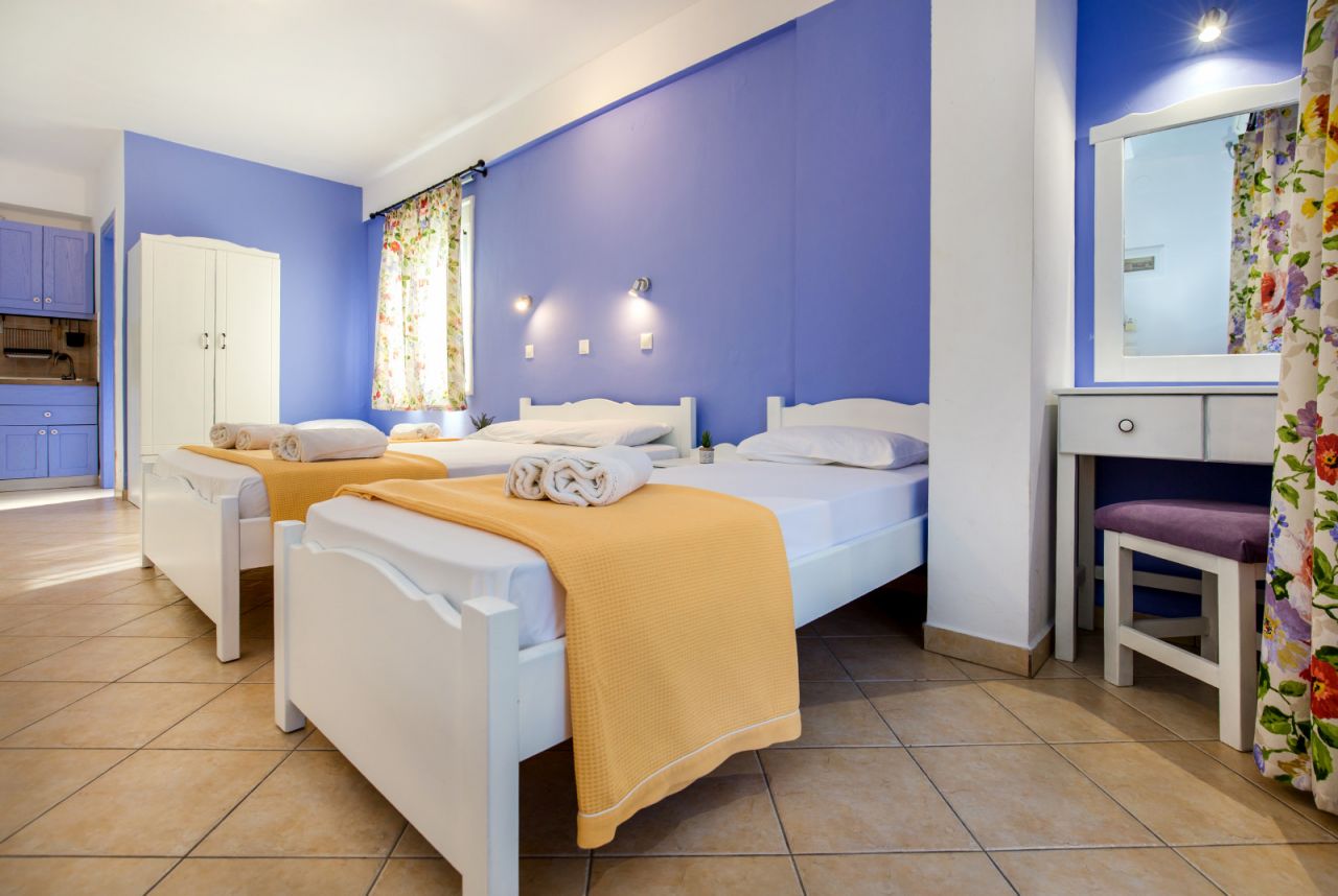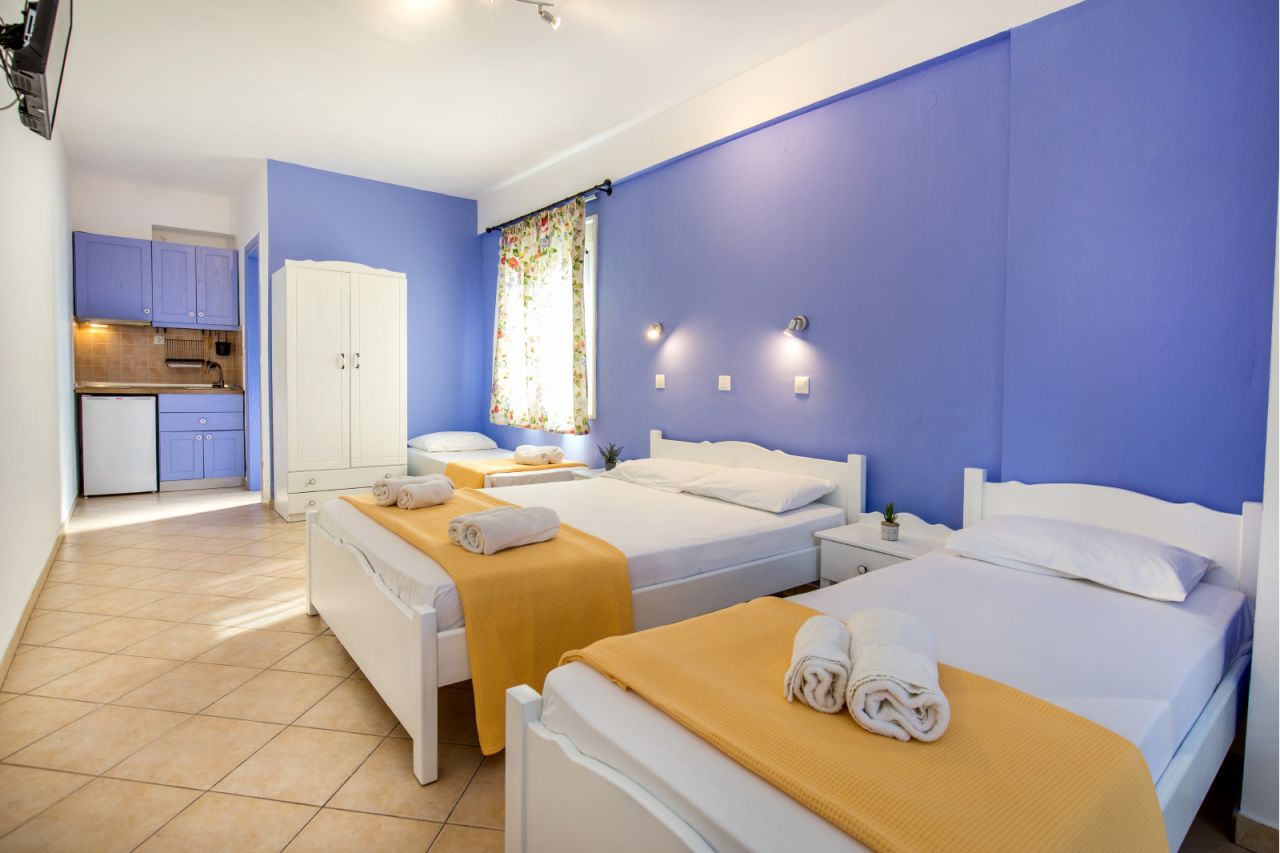 Διαθέτουμε 8 μεγάλα και πλήρως εξοπλισμένα studios (μπάνιο, κουζίνα, ψυγείο, κλιματισμό, TV, ασύρματο internet) κάποια με θέα την θάλασσα, και ένα δίχωρο διαμέρισμα με αυλή. Για όλα τα διαμερίσματα υπάρχει χώρος πάρκινγκ.